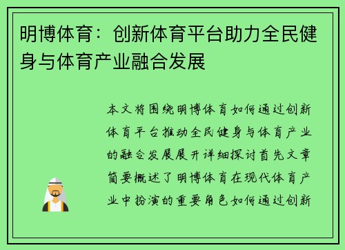 本文将围绕明博体育如何通过创新体育平台,推动全民健身与体育产业的融合发展展开详细探讨。首先,文章简要概述了明博体育在现代体育产业中扮演的重要角色,如何通过创新技术和平台模式,推动全民健身活动的普及与体育产业的持续升级。接着,本文将从四个方面深入分析明博体育的影响力,包括“平台创新推动健身普及”、“科技赋能助力体育产业升级”、“融合发展提升全民健身质量”和“产业生态链的构建与优化”。每个方面的讨论都将详细阐述明博体育如何通过创新实现目标,并为未来的体育行业带来深远影响。最后,文章将结合以上分析内容,对明博体育的成功经验进行总结,并对未来体育产业的发展提出一些展望。